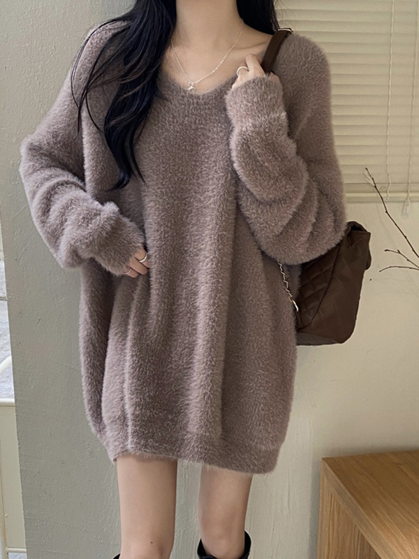 Solid V Neck Fuzzy Loose Sweater