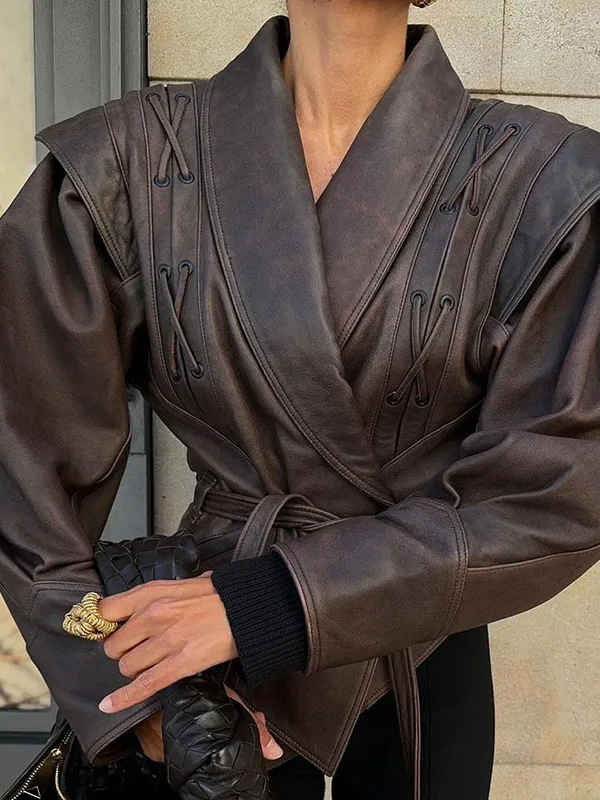 Lapel Lace Up Leather Long Sleeve Jacket