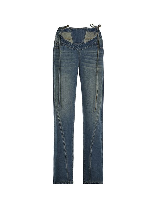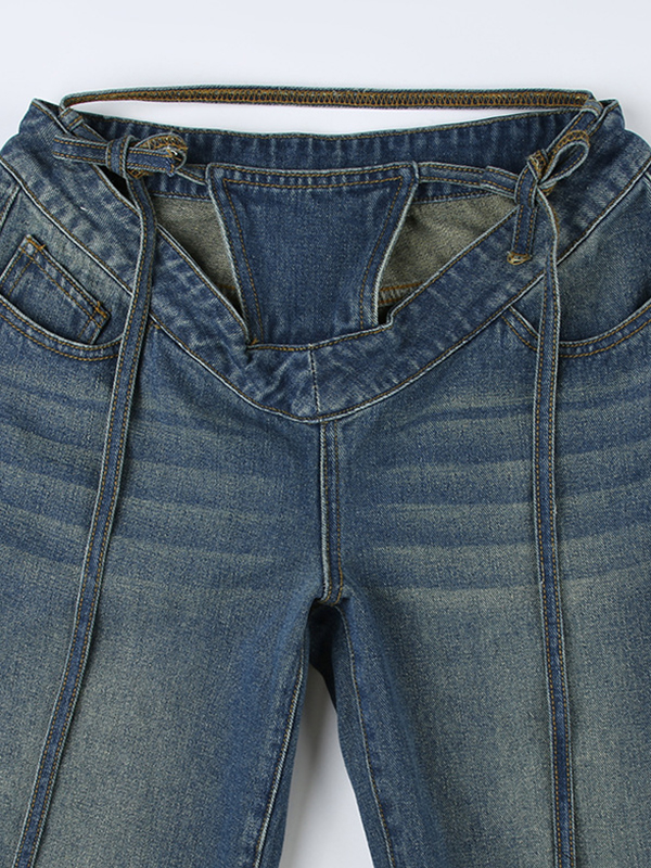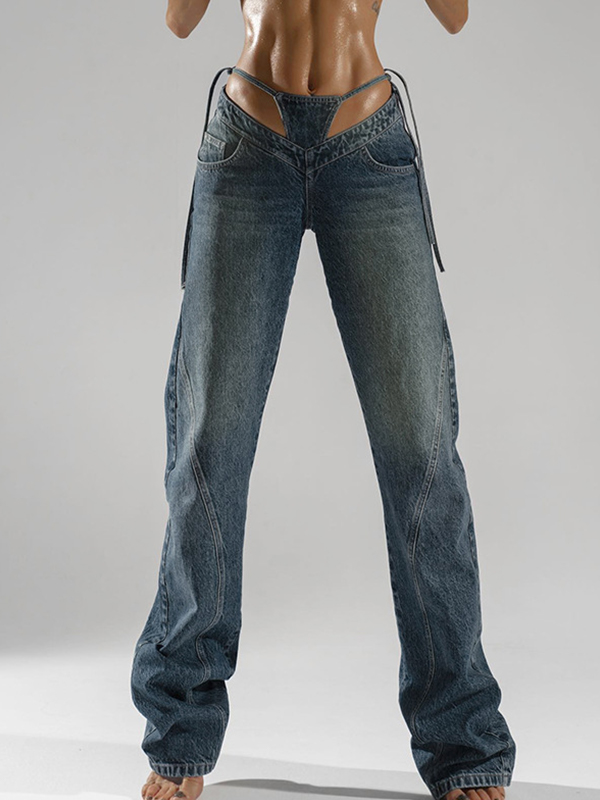 Personalized Hollow V-Waist Underwear With Lace-Up Splicing Boyfriend Jeans