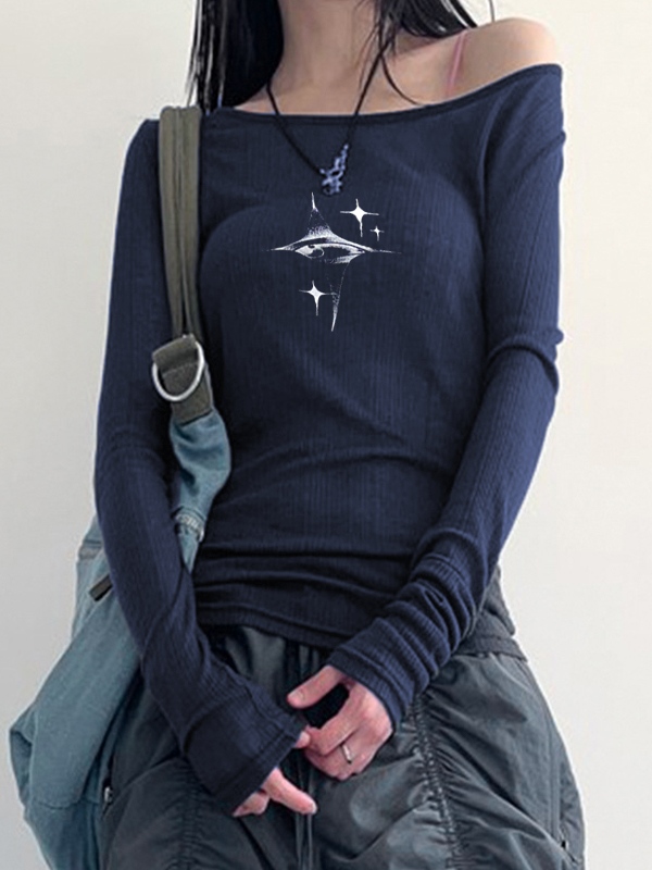 Vintage Star Print Off Shoulder Long Sleeve Knit
