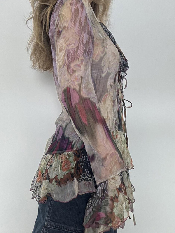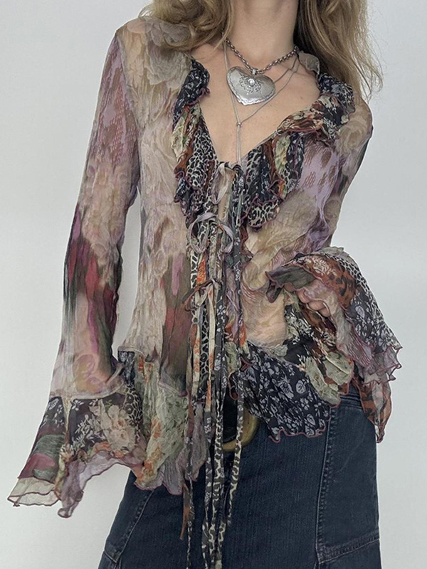 V-Neck Lace-Up Bell Sleeves Long Sleeve